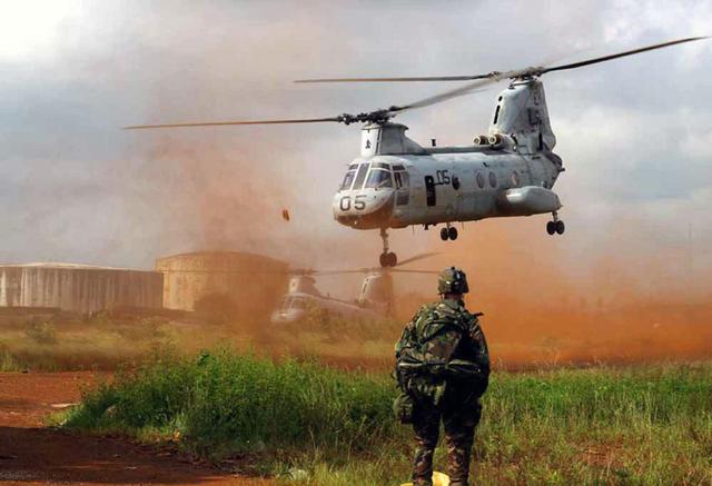 Monrovia(リベリアの首都)において大使館の増強、警備、補給作戦を実施した。HMM-264は4機のCH-46Eと2機のUH-1Nをドック型輸送揚陸艦ポンス Ponce(LPD-15)に搭載し、大西洋を横断して出航した。2か月間にわたり、“ブラック・ナイツ”はシエラ・レオネのフリータウンを拠点に、過酷な環境と長距離作戦に伴う兵站上の課題にもかかわらず、海兵隊員および米国大使館を支援した。 |