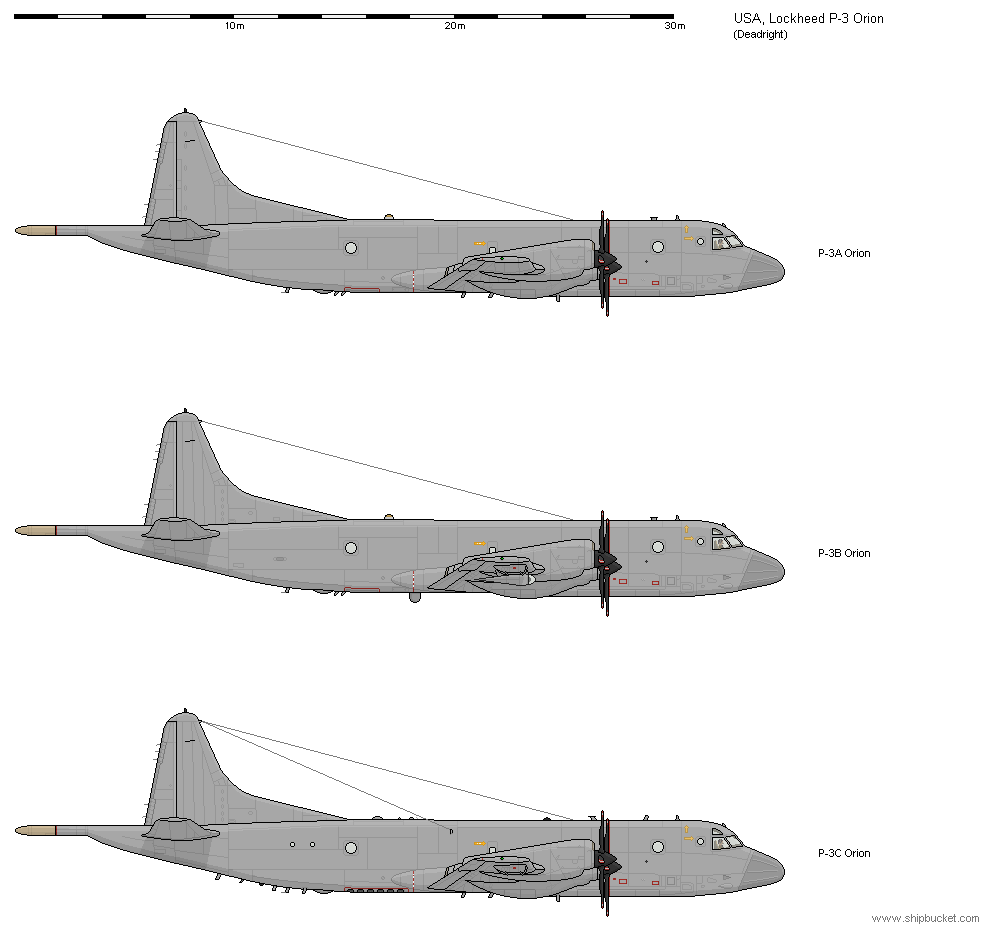 - ロッキード社(現ロッキード・マーチン社)製 初飛行:1959年11月25日(YP3V-1 Bu.No. 148276) P-3Cデータ=全幅:30.37m 全長:35.61m 全高:10.27m 翼面積:120.77m² 空虚重量:27,890kg 最大離陸重量:61,235kg 最大許容重量:64,410kg 最大着陸重量:47,119kg パワープラント:3,661eKWのアリソン製T56-A-14ターボプロップ・エンジン4基 燃料搭載量(最大使用可能):34,826リットル 最大水平速度(高度4,575m):761km/h 通常巡航速度(高度7,620m):608km/h 最大上昇率:594m/min 実用上昇限度:8,625m 航続性能(通常):3,835km 通常作戦行動半径(高度457mでオンステーション3時間):2,494km 兵装:機内兵器倉に最大搭載量3,629kg、計10ヶ所の機外ハードポイント(中央翼に4ヶ所と外翼下6ヶ所)に爆弾、ロケット弾およびミサイルを搭載可能(AGM-65マーヴェリック、AGM-84ハープーン、AGM-84E/H SLAM/SLAM-ER、B57核爆弾、Mk. 101ルル核爆雷を含めて最大9,071kg) 乗員:11名