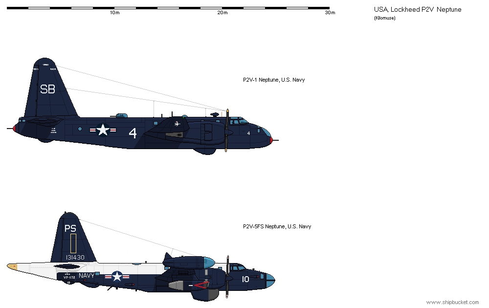 - ロッキード社(現ロッキード・マーチン社)製 初飛行:1945年5月17日(XP2V-1 Bu.No. 48237) P2V-7/SP-2Hデータ=全幅:30.87m 全長:29.23m 全高:8.93m 翼面積:92.90m² 空虚重量:22,650kg 全備重量:33,175kg 最大重量:36,240kg パワープラント:3,500馬力のプラット&ホイットニー製R-3350-32Wターボコンパウンド・エンジン2基、推力33.34kNのJ34-W-36ターボジェット・エンジン2基 最大速度(高度4,625m):648km/h 巡航速度:370km/h 初期上昇率:549m/min 実用上昇限度:6,705m 航続距離(通常):3,450km 航続距離(最大):5,930km 兵装:3,630kgまで搭載可能、Mk. 4/90核爆弾、Mk. 101ルル核爆雷 乗員:7名~9名