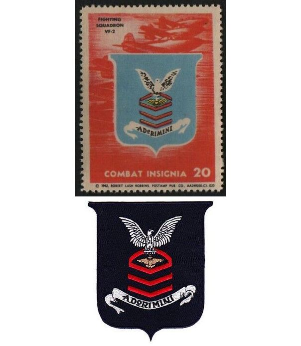 - ※第2戦闘飛行隊(Fighter Squadron 2: VF-2)は1927年7月にVF-2B(Bは戦闘部隊 Battle Forceの略)として創設され、1932年にVF-2S(Sは偵察部隊 Scout Forceの略)に改称、1933年にはふたたびVF-2B、そして1937年には最終的にVF-2となった。“フライング・チーフス Flying Chiefs”は、アメリカ海軍で唯一、基本的に下士官パイロット(海軍航空パイロット、NAP)で構成された飛行隊であった。真珠湾攻撃当時、彼らはF2Aバッファロー戦闘機を運用し、翌春になってようやくF4Fワイルドキャットを導入した。彼らが唯一戦闘に参加したのは珊瑚海海戦であり、航空母艦レキシントン Lexington(CV-2)を拠点として活動し、17機を撃墜したが、士官7名と下士官2名を失った。VF-2は1942年7月1日に閉隊。画像下の切手は1942年にハースト出版社 Hearst Publishing Companyから発行された。記章には、アメリカン・イーグルを組み込んだ上級兵曹のシェヴロンが描かれている。シェヴロンは“Adorimini”という文字が刻まれた盾の上に配置されている。これは“Up and at 'Em(立ち上がれ、奴らを攻撃せよ)”と意訳され、シーザー軍団が用いた鬨の声。(