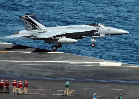 ↑VFA-143 F/A-18E Super Hornet takes off from USS Dwight D. Eisenhower. Image courtesy of en.wikipedia.org.
