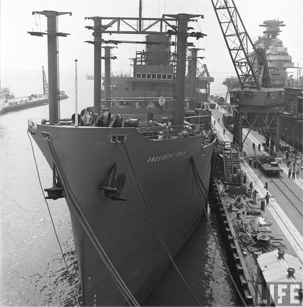 ↑SS President Polk at a Tidewater, Virginia shipyard after builder's delivery, 6 November 1941. This was prior to being allocated the War Shipping Administration for American President Lines for operation on 5 December 1941. Photo by George Strock, Life Magazine. Used for educational and non-commercial purpose. Image courtesy of NavSource.