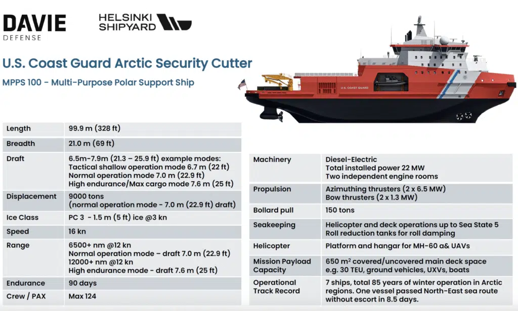 ↑The specifications for the U.S. Coast Guard's Arctic Security Cutter that Davie Defense intends to build at the planned "American Icebreaker Factory" if awarded the contract to build these proven design icebreakers. (Image: Davie Defense). Image courtesy of NAVALNEWS.