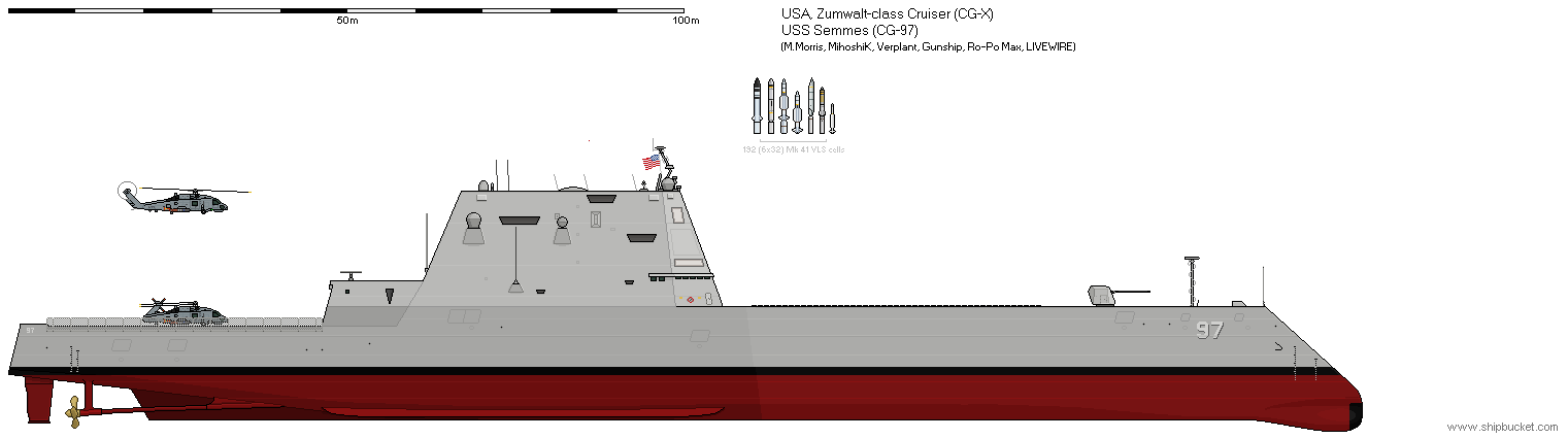 - ※以上のデータはあくまでも計画値である。水上戦闘艦グループ SCF(Surface Combatant Family)の一部で建造隻数は未定。タイコンデロガ級の後継。ズムウォルト級ミサイル駆逐艦で検討されたステルス船体や電動機推進を含む統合電動システム(Integrated Power System)などをベースにすることになる。弾道ミサイル防衛機能を強化した対空戦を主任務にするため、ズムウォルト級の2周波数帯レーダー(Dual Band Radar)より高いレーダーを装備し、弾道ミサイル迎撃ミサイルとして新規開発中のKEI(Kinetic Energy Intercepter)を搭載する予定。計画当時、燃料価格高騰のため、ガス・タービンではなく原子力機関の案(CG(X)N)も出ている