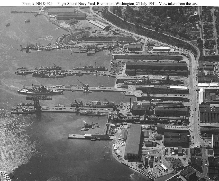 - ※ピュージェット・サウンド海軍造船所 Puget Sound Naval Shipyardはもともと海軍基地として1891年に設立され、1901年に海軍工廠ピュージェット・サウンド Navy Yard Puget Soundと命名した。第一次大戦中、海軍工廠は25隻の駆潜艇、7隻の潜水艦、2隻の掃海艇、7隻の航洋曳船、2隻の給兵艦だけでなく、1,700隻の小型ボートを含めた多数の艦船を建造。第二次大戦中、造船所の主な取り組みは、アメリカ艦隊と同盟国の艦船の戦闘損傷を修理した。1945年11月30日には海軍工廠ピュージェット・サウンド Navy Yard Puget Soundは、ピュージェット・サウンド海軍造船所と改名。造船所は、従来のフライト・デッキからアングルド・デッキに換装するなど、航空母艦の大規模な近代化プログラムに従事。朝鮮戦争時には、造船所は船の再活性化に従事していた。1950年代後半に造船所は、新しいクラスのミサイル・フリゲイトの建造の時代に入った。1965年にピュージェット・サウンド海軍造船所にとっては最初の原子力潜水艦であるスカルピン Sculpin(SSN-590)を整備した。1990年に海軍は、ピュージェット・サウンド海軍造船所で原子力船をリサイクルするプログラムを承認。造船所の作業負荷の約6%が不活性化、原子炉区画処分、船舶のリサイクルを伴う。造船所は、原子力船を不活性化やリサイクル、環境に安全な方法を開拓してきた。2003年5月15日にはピュージェット・サウンド海軍造船所と(ワシントン州 State of Washingtonのバンゴール Bangor、ブレマートン Bremertonとエヴァレット Everettにある)海軍中間保守機能施設、太平洋岸北西部 Naval Intermediate Maintenance Facility, Pacific Northwestは1つの保守活動に統合-PSNS&IMFに作成された。統合は、税務ドルのための可能な最もメンテナンスの手間を達成しながら、海軍は、リアルタイムの船のメンテナンスの必要性最も高い優先度を達成できるようにすることで、艦隊の準備状況を改善する。 当初、トライデント改装機能施設(TRF)、バンゴール TRIDENT Refit Facility (TRF), Bangorとして知られている海軍中間保守機能施設、太平洋岸北西部は、西海岸のトライデント・ミサイル潜水艦隊の主な整備施設として1981月7月31日に設立。1998年にはTRFはエヴァレットとブレマートンのショア中級メンテナンス活動 Shore Intermediate Maintenance Activityと統合し、海軍中間保守機能施設(NAVIMFAC)太平洋岸北西部になった。海軍は6つの乾ドックのうち最も古いものは1906年に最初に建設。第4号乾ドック Dry Dock No. 4と第5号乾ドック Dry Dock No. 5はいずれも1940年代初頭に建設され、第6号乾ドック Dry Dock No. 6は空母のオーヴァーホールに使用され、1962年に完成したものである。13マイル離れたバンゴールにあるデルタ・ドライ・ドック delta dry dockは、海軍の核弾道ミサイル潜水艦の支援システムの一部として1980年代に完成したもの