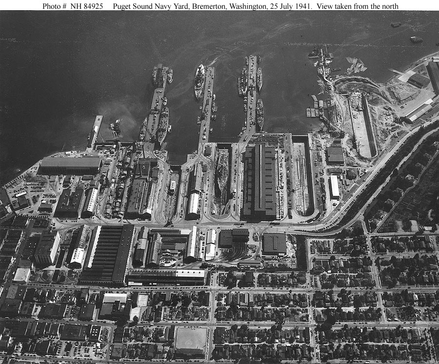 ↑Puget Sound Navy Yard, Bremerton, Washington. View from the north on 25 July 1941, taken from an aircraft based at Naval Air Station, Seattle, Washington. Among the ships present are: USS Barnegat (AVP-10) and USS Biscayne (AVP-11), fitting out on the left side of the long pier in left center; USS Casco (AVP-12) and USS Mackinac (AVP-13), under construction in the drydock at left; USS Colorado (BB-45), alongside the middle of the three longest piers; USS Utah (AG-16), in drydock in the center of the photo; USS Aroostook (AK-44, ex-CM-3) and USS Prometheus (AR-3), alongside the right side of the long pier in right center. Official U.S. Navy Photograph, from the collections of the Naval Historical Center. Image courtesy of HyperWar.