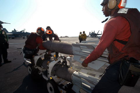 ↑Loading of Mark 83 1,000-pound general-purpose bombs. Image courtesy of en.wikipedia.org.