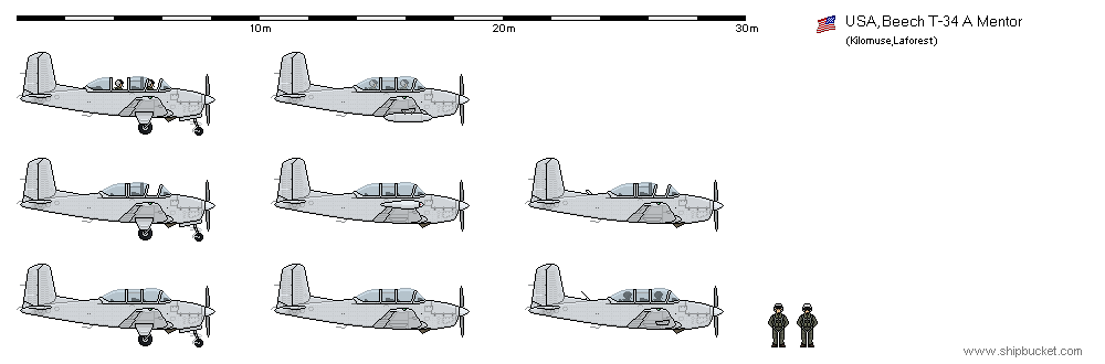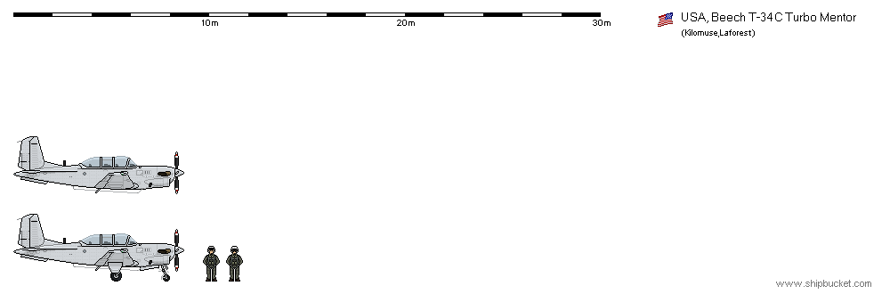 - ビーチクラフト社(現テクストロン・エヴィエーション)製 初飛行:1948年12月2日(モデル45) T-34Cデータ=全幅:10.16m 全長:8.75m 全高:2.92m 翼面積:16.88m² 自重:1,342kg 最大離陸重量:1,950kg パワープラント:定格出力715hp(533kW)のプラット&ホイットニー製PT6A-25ターボプロップ・エンジン1基(400hpに減格) 最大巡航速度(5,180m):396km/h 実用上昇限度:9,145m 航続距離(6,095m):1,311km 乗員:2名