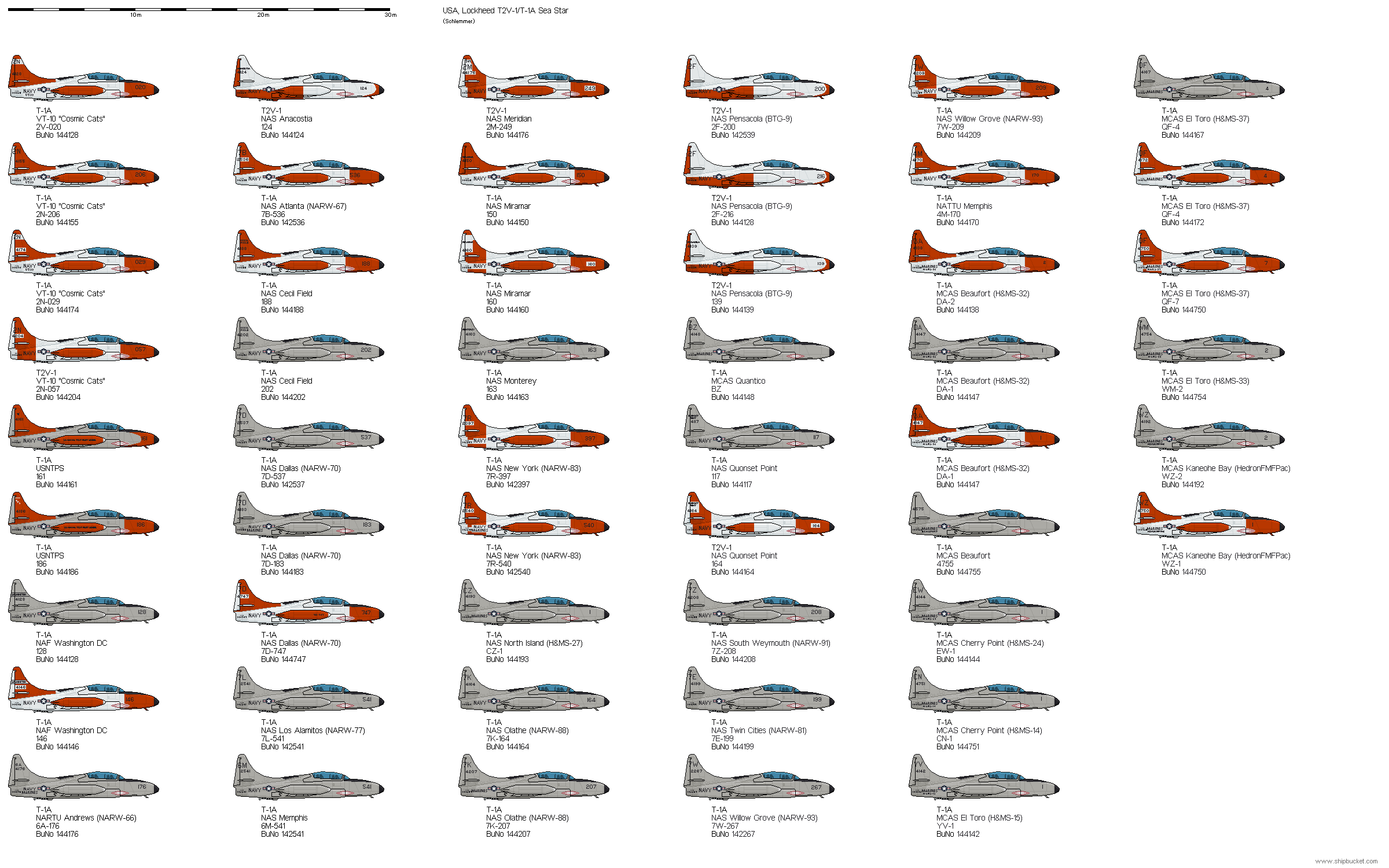 - ロッキード社(現ロッキード・マーチン社)製 初飛行:1953年12月15日(L-245) T2V-1データ=全幅:13.06m 全長:11.75m 全高:4.06m 翼面積:22.3m² 空虚重量:5,427kg 総重量:7,031kg 最大離陸重量:7,636kg パワープラント:定格推力27kNのアリソン製J33-A-24/24Aターボジェット・エンジン1基 飛行最大速度:933km/h(高度10,670m) 実用上昇限度:12,190m 上昇率:1,929m/min 航続距離:1,560km 乗員:2名