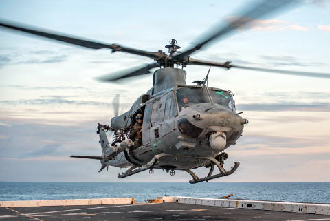 ↑7TH FLEET AREA OF OPERATIONS (February 6, 2026) - U.S. Marines, with Marine Medium Tiltrotor Squadron (VMM) 265 (Rein.), 31st Marine Expeditionary Unit (MEU), conduct flight operations with a UH-1Y Huey helicopter, also from VMM 265 (Rein.), 31st MEU, equipped with an electronic warfare pod, on the flight deck of the San Antonio-class amphibious transport dock ship, USS New Orleans (LPD 18), while underway, Feb. 6, 2026. Tripoli Amphibious Ready Group (ARG), composed of America-class amphibious assault ship USS Tripoli (LHA-7), San Antonio-class amphibious transport dock ships USS New Orleans (LPD-18) and USS San Diego (LPD-22), along with the 31st Marine Expeditionary Unit (MEU), are underway conducting routine operations in the U.S. 7th Fleet area of operations. U.S. 7th Fleet is the U.S. Navy's largest forward-deployed numbered fleet, routinely interacts and operates with allies and partners in preserving a free and open Indo-Pacific. (US Navy photo by Mass Communication Specialist 2nd Class Sade' Anita Wallace)