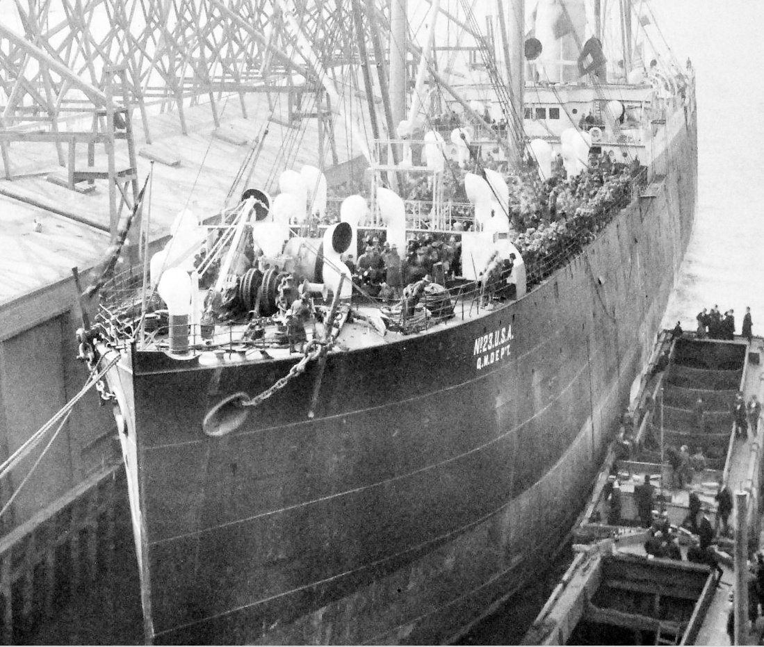 ↑USQMDE No. 23 moored pierside with lighters alongside and crowded with soldiers, probably New York, circa 1898-1899. Image courtesy of NavSource.