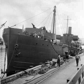 ↑Caption: Mauna Loa, her paintwork showing much wear, lies at the Pearl Harbor Navy Yard, T.H., at the beginning of her conversion, 14 July 1942. (U.S. Navy Bureau of Ships Photograph, 19-LCM Collection, National Archives and Records Administration, Still Pictures Branch, College Park, Md.) Image courtesy of Naval History and Heritage Command.